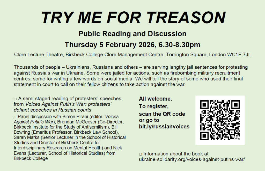 Thursday 5th February, 6.30 pm. Try Me For Treason: readings from speeches by anti-war protesters in Russian courts, and discussion. Clore Lecture Theatre, Birkbeck College Clore Management Centre, Torrington Square, London WC1E 7JL. REGISTER to attend here.