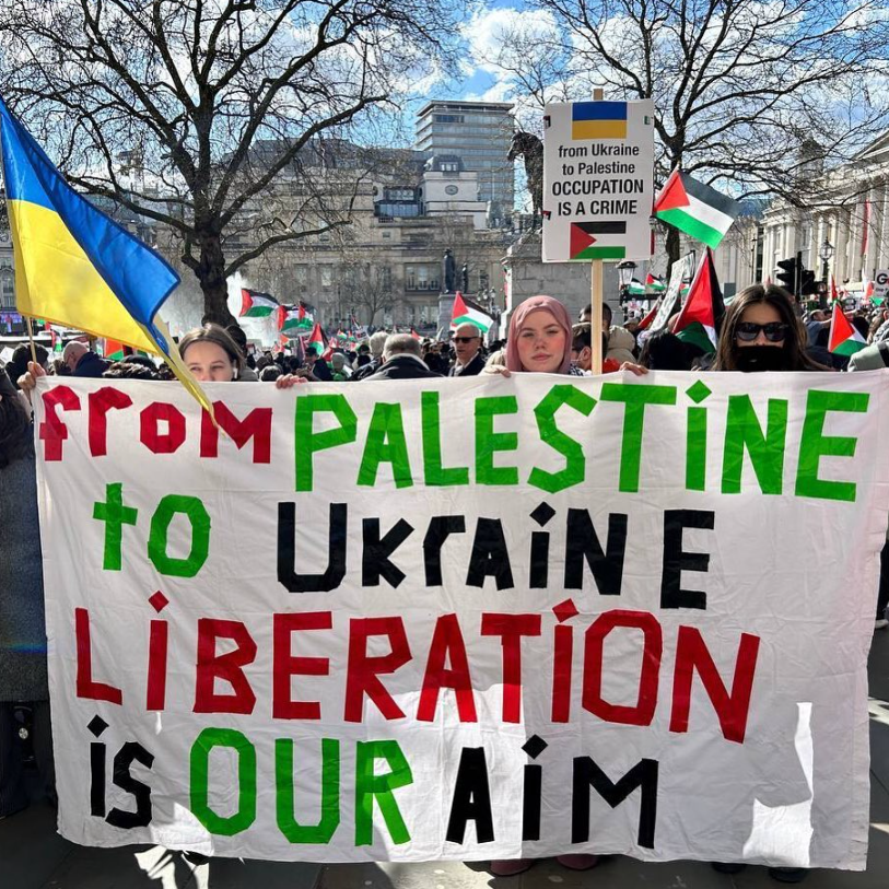 Ukraine and Palestine are both small nations resisting a vicious colonial power. Their circumstances and allies are different, but their causes stand on the same foundation. Both Ukrainians and Palestinians have a right to be free and to resist genocide and occupation. Both peoples deserve our international solidarity.