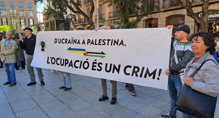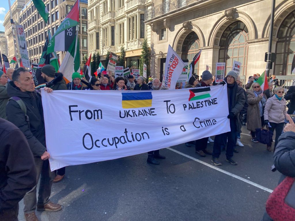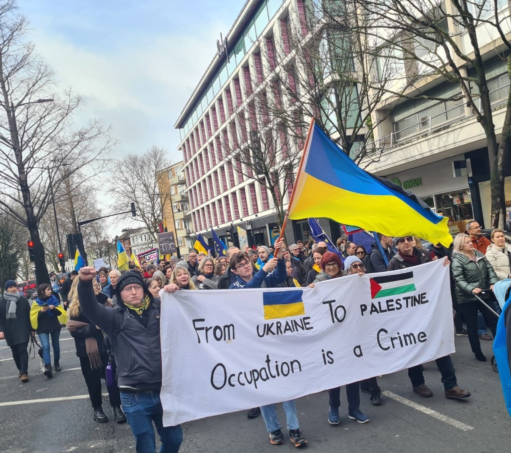 For the last year and a half, a group of us have participated in anti-war demonstrations, against Israel’s war on Palestine and against Russia’s war on Ukraine, with our banner saying “From Ukraine to Palestine, Occupation is a crime”.
