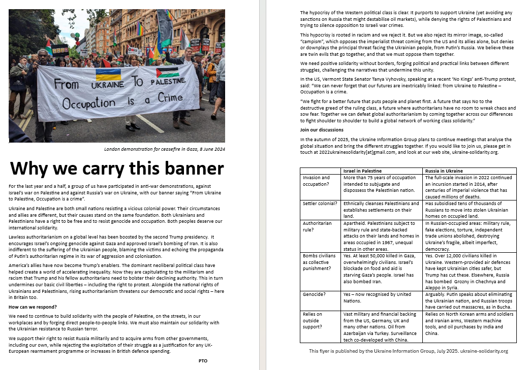 In the autumn of 2025, the Ukraine Information Group plans to continue meetings that analyse the global situation and bring the different struggles together. If you would like to join us, please get in touch at 2022ukrainesolidarity[at]gmail.com, and look at our web site, ukraine-solidarity.org.
